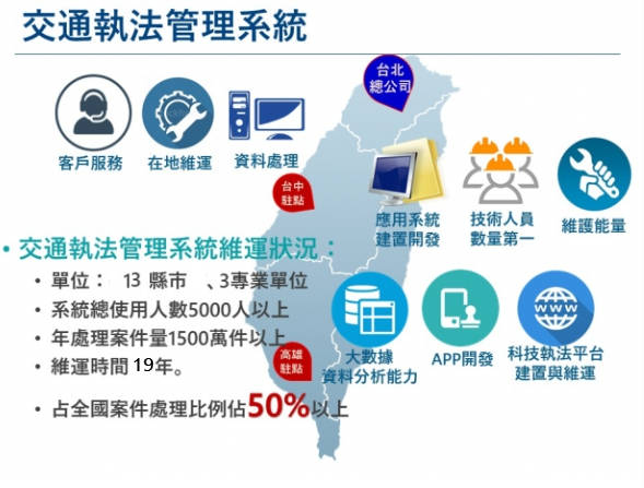 a.客戶服務 b.北、中、南三區在地維運 c.委外資料處理建檔 d.應用系統建置開發 e.維護能量充足 f.大數據資料分析能力 1. 單位:13縣市、3專業單位 2. 系統總使用人數5000人以上 3. 年處理案件量1500萬件以上 4. 維運時間19年 5. 佔全國案件處理比例佔50%以上